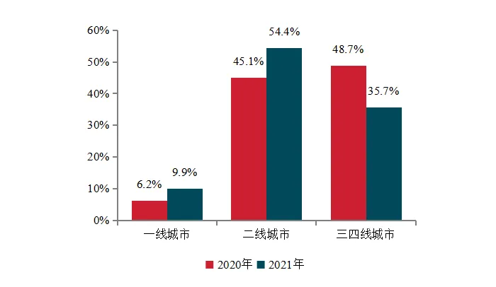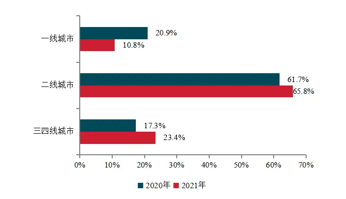 中国房地产101-200强代表企业2020、2021年各等级城市销售额分布