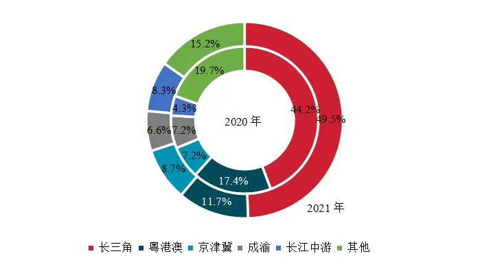 中国房地产101-200强企业聚焦深耕城市群,持续扩大市场占有率,实现了销售业绩的稳步增长。从30家代表企业重点项目销售情况来看,长三角、粤港澳、京津冀、成渝和长江中游五大城市群是其销售额主要来源区域,贡献占比总计达84.8%,占比较2020年增长4.5个百分点。