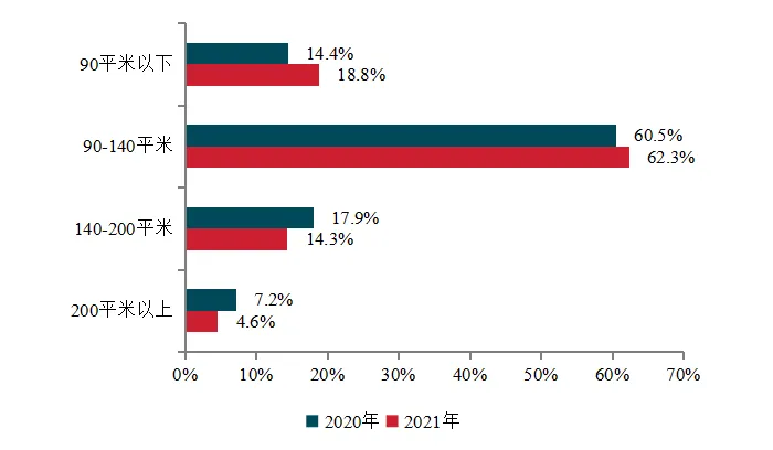 2021年,101-200强企业把握市场主流需求,顺应需求变化加推首置类和首改类产品,助力项目的快速去化。从代表企业重点项目各面积段产品的销售占比情况来看,90平米以下的首置类产品销售占比为18.8%,较上年增长4.4个百分点;90-140平米的首改类产品占比高达62.3%,较去年增长1.8个百分点;140-200平米的改善类产品和200平米以上的改善类分别下降3.6个百分点和2.6个百分点,占比为14.3%和4.6%。
