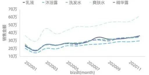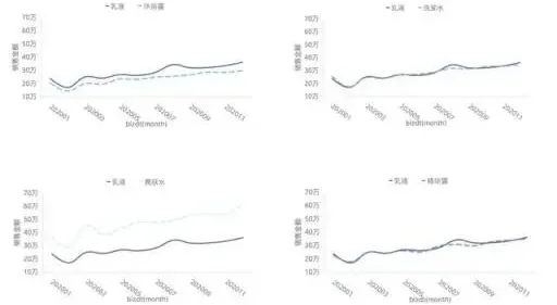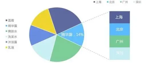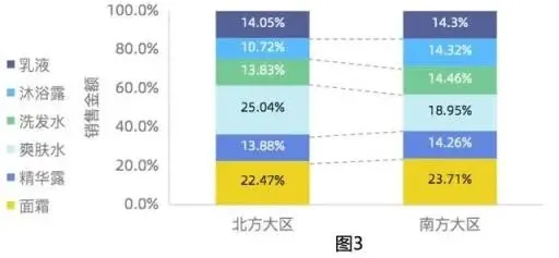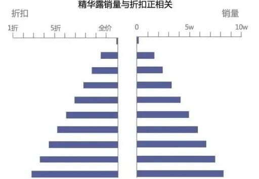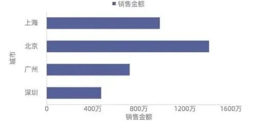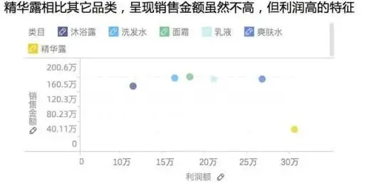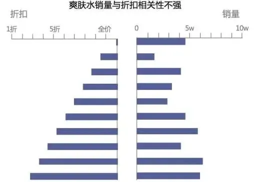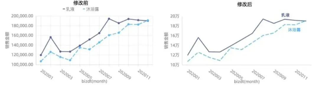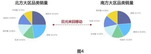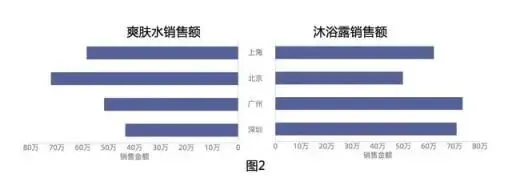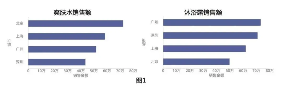 上图可以发现对于相同的数据,因为我们所需表达的主题的差异,也将呈现完全不同的展现方式。图1表达的主题是爽肤水和沐浴露两个品类在不同城市的销量排名,图2主要表达的主题是在相同城市在两个不同的品类的销量差异。