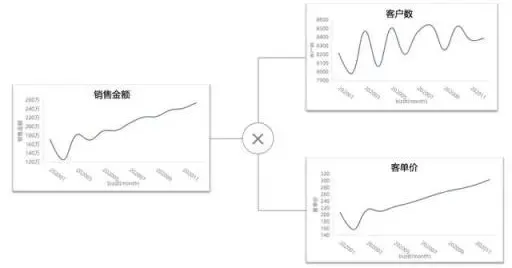 当一个折线图的数值,是可通过一个公式生成的,可将公式中的计算因子分别拆分到计算树中,使听众可清晰看到每部分计算因子的变化情况: