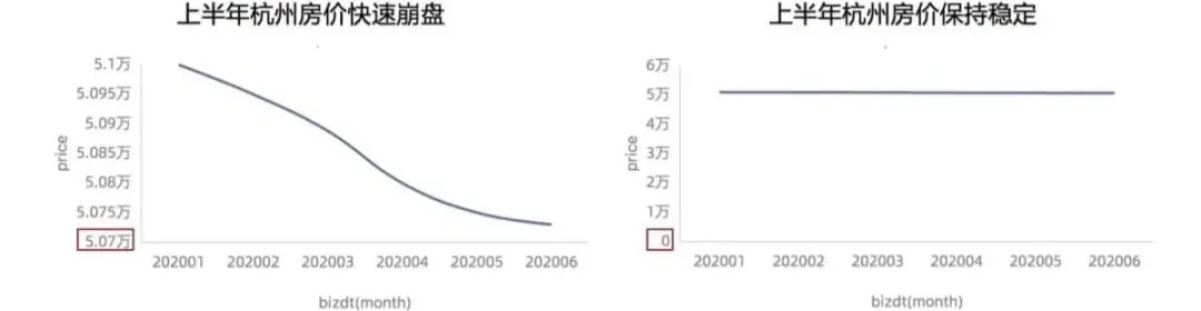 不同的刻度基线会产出完全相反的数据主题解读。看以下2张图,同样都是对杭州房价的描述: