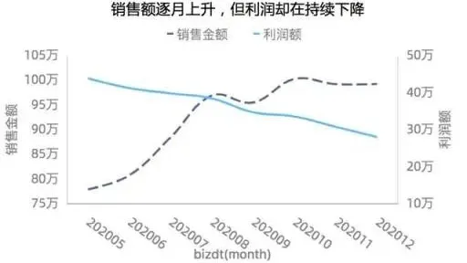 对比可能不仅仅是一种对比关系,有可能是结合上文所说的成分、项目间、时间序列、频率分布、相关性对比中的一种或多种组合而成,我们称之为“多重对比”。例如“销售额在过去10年内稳步增长,但利润却没有同步增长”,这案例第一部分“销售额在过去10年内稳步增长”属于“时间序列对比”,第二部分“但利润却没有同步增长”属于项目间对比。对于这种情况,我们需要确定哪一种关系是主要的,哪一种是次要的。案例中,第一部分随时间变化是主要的,而销售额与利润项目间对比是次要的,因此最好选择以时间变化对比的折线图,并为每一个项目画一条支线的方式实现,如下图: