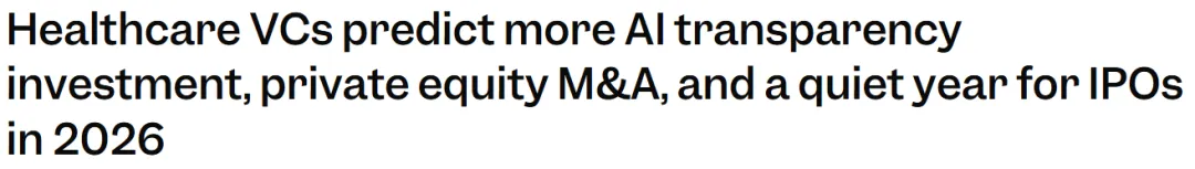 在经历了医疗健康领域强劲的一年融资后,风险投资(VC)机构计划在 2026 年将资金投向不同类型的 AI 创业公司。投资者预计,专注于决策透明度和成本节约的 AI 初创企业将吸引更多资本。风险投资机构不预期明年会有大量医疗健康公司 IPO,但私募股权(PE)可能通过收购 AI 企业带来流动性。