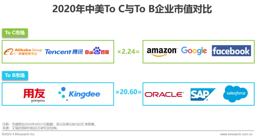 受益于巨大的人口红利(劳动力红利和注意力红利)和互联网、移动互联网的飞速发展,中国的To C领域的企业已经达到了与美国对应企业接近的体量。但是受制于中国企业整体的信息化水平和信息化素养,以及二元化结构(城乡企业二元化,国企私企二元化),企业服务领域,中国企业与美国企业的体量仍有较大差距。尽管这一差距并非短期就能赶上,但仍预示着企业服务领域,具有巨大的成长空间。
