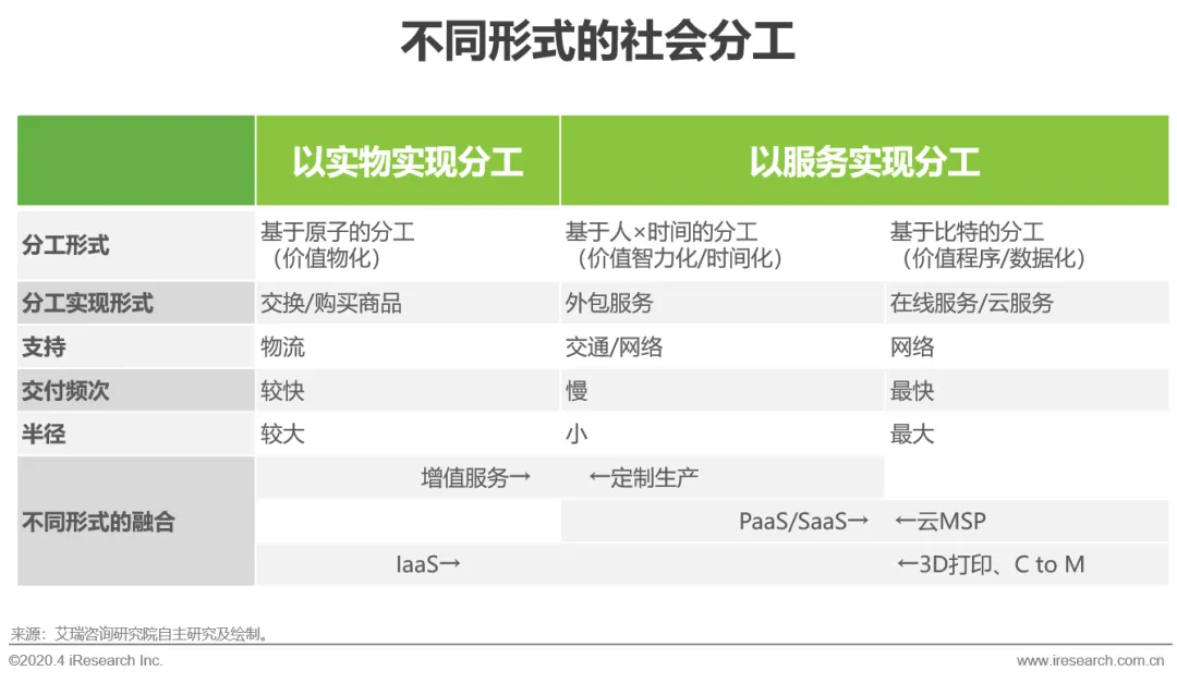 人类最早出现的社会分工,为商品交换,可称其为“羊和斧子”的分工。再之后是合作生产,可称其为“斧头和斧柄”的分工。受益于交通运输的发展,基于“物”的分工,在全世界范围内大规模展开。人难以标准化,运输(交通)成本也显著高于物;因此,一直以来,服务企业要么为地域性的,要么为全球范围内极细分领域的(如高端咨询和精密维修)。也就是,服务半径不足,所能覆盖的市场天花板较低。
