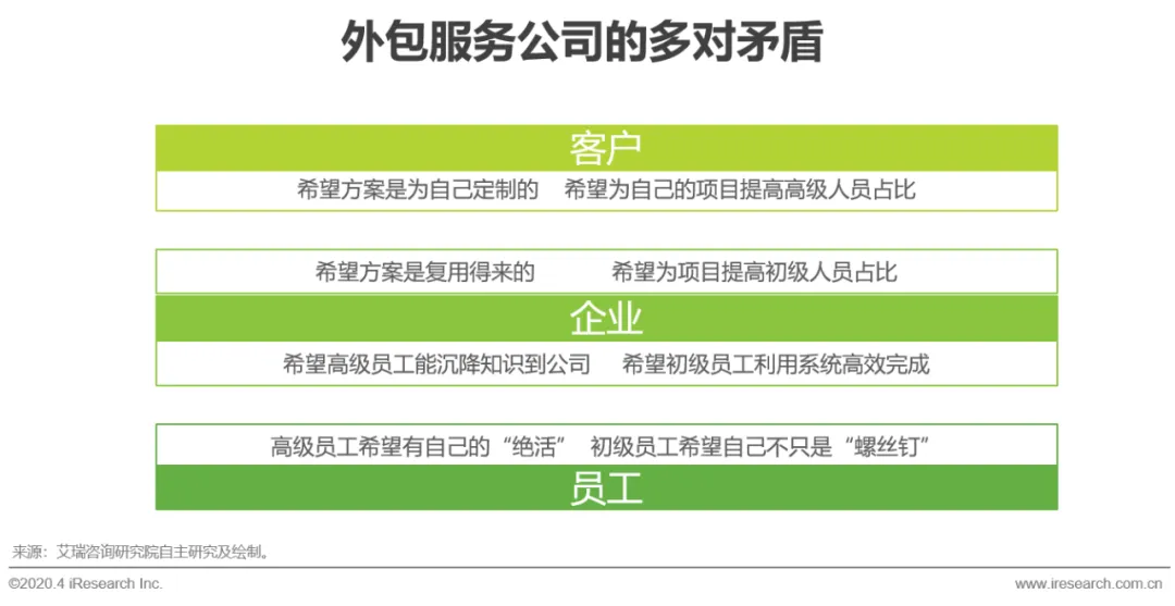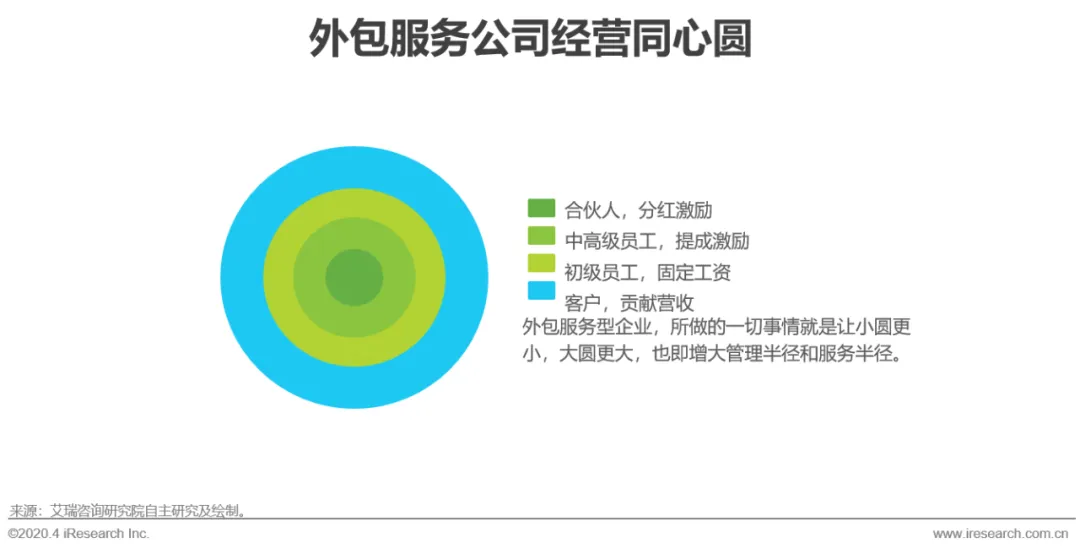 外包型企业服务,规模效应往往不明显,企业大小与盈利水平不相关。企业实现更高的盈利水平,只有向两个方向发展,即对外提高客单价和对内降低成本。提高客单价需要:1)提供更优质的、更具有创新性的服务,客户为了不可替代性而采购;2)集成性的解决客户多个痛点,客户为了省心而采购。降低成本需要:1)提高项目经验的复用性;2)提高初级人员占比,让本是高级人员该完成的工作,初级人员也能完成。内外这两个方向,本身相悖,管理工作就是巧妙地解决这些矛盾,也就是:1)能够复用性地快速完成服务,而客户仍感觉有很强的定制性;2)能够在提高初级人员占比的情况下服务质量仍得到保障;3)能够让高级员工乐于分享,让个人智慧成为集体智慧;4)能够让初级员工在高效甚至机械性工作的前提下仍获得幸福感和成就感。