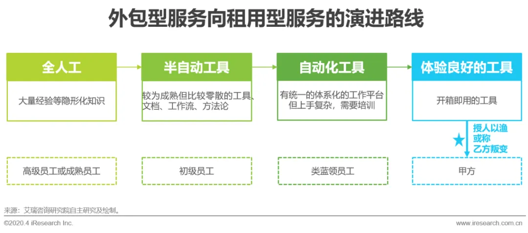 在外包型企业服务中:一方面乙方企业提高复用性和自动化程度以降低成本,让系统的作用越来越强大,人的作用越来越小(在重复性的工作中)。另一方面乙方不希望甲方知晓自己的成本降低,以维持高客单价。这种秘密的保守不可能长期维持下去,因为竞争的存在:总有某个乙方,为了扩大自己的服务半径,揽取更多的客户,采用薄利多销的策略,将沉降了大量经验、知识的工具或者系统,直接售卖或者租用给甲方。甲方采购之后,便无须再去采购高价的外包型的、项目制的服务。从服务甲方角度看,是授之以渔;但从整个业态来看,相当于某个乙方将业内普遍用来“吃饭”的工具打包给了甲方,可以看作是“乙方的叛变”。外包变租用的目的是增加服务半径。