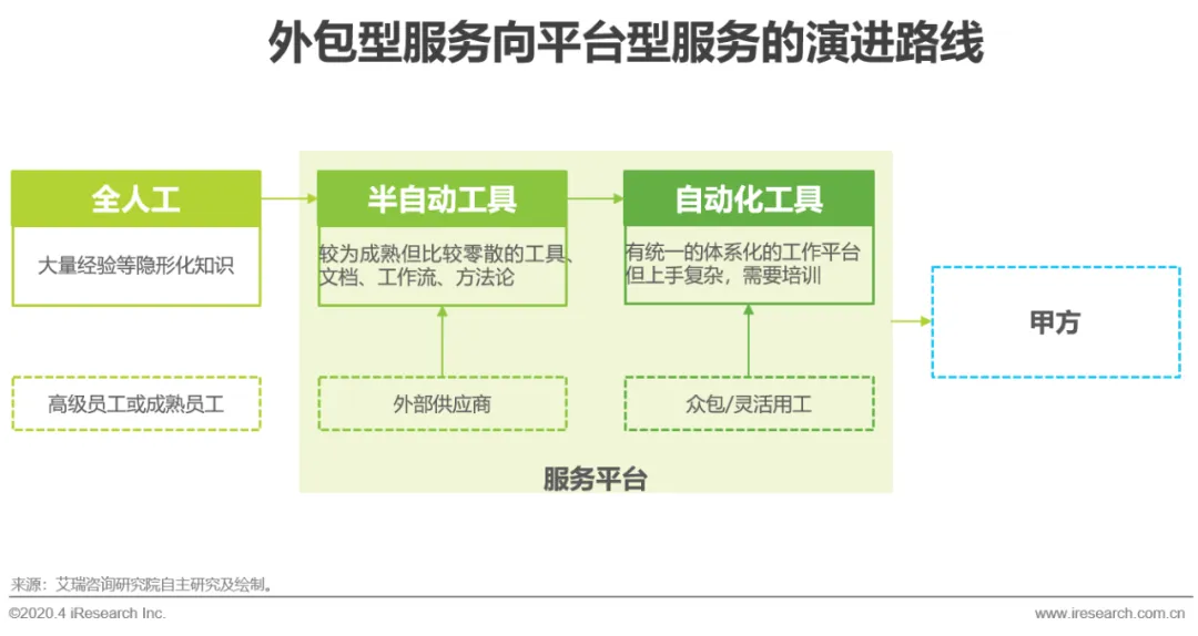外包型服务特点:1)复杂性高、标准化程度低、客单价较高。2)甲方花钱买省心。平台型服务特点:标准化程度高,高频、低价,但常无法完全自动完成。租用型服务特点:可自动完成,或依赖于资源。外包、租用和平台,无法完全区分,常相互交织。比如,乙方承接了甲方的电话呼叫业务,既可以看作甲方将业务进行外包,也可以看作乙方将呼叫中心(含人员)出租给了甲方。再比如,当租用型业务的复杂度超过了甲方的订单式购买能力,会在甲乙方之间诞生出做外包的中间层,云MSP即是此类。