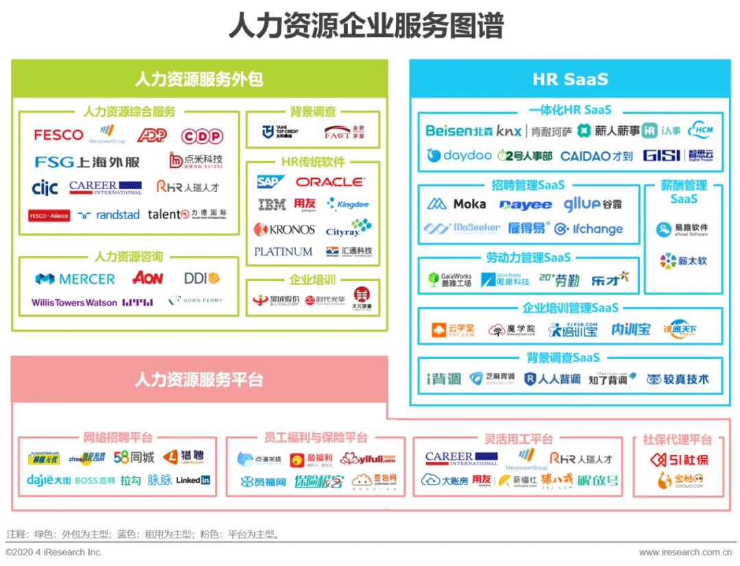 企业服务根据服务模式可以分为:外包型、租用型和平台型。根据服务内容可以分为:业务型、应用型、技术型和资源型,其中应用型又可以分为获客型、工具型和管理型。根据应用的通用场景可以分为:人力资源、财税工法、协同办公、资源管理、营销获客、销售客服、中台及低/零代码、金融服务、数据和智能、安全和运维、采购供应、物流服务、开发服务和IT基础资源等。根据应用的垂直场景可以与不同行业结合,分为:教育、医疗、房产、零售,等等。