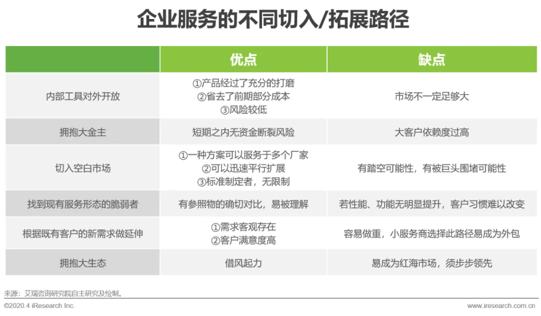 切入或拓展企业服务业务的途径有多种:1)内部好用的工具对外开放:如Slack(游戏公司的内部协同工具),早期AWS的S3服务、云测的数据标注业务、神策的客景。2)拥抱大金主:一般为定制型、外包型服务,前期必须有一定的积累或者有特殊资源,如数据港服务于阿里巴巴的数据中心建设、运营。3)切入空白市场或风口市场:如草料二维码、千聊、小鹅通等。4)找到现有服务形态的脆弱者:如新型收银系统对传统POS机和收银系统的取代。5)根据既有客户的新需求做延伸:如京东企业业务,不断根据客户需求进行边界延伸。6)拥抱大生态:如有赞和微盟。
