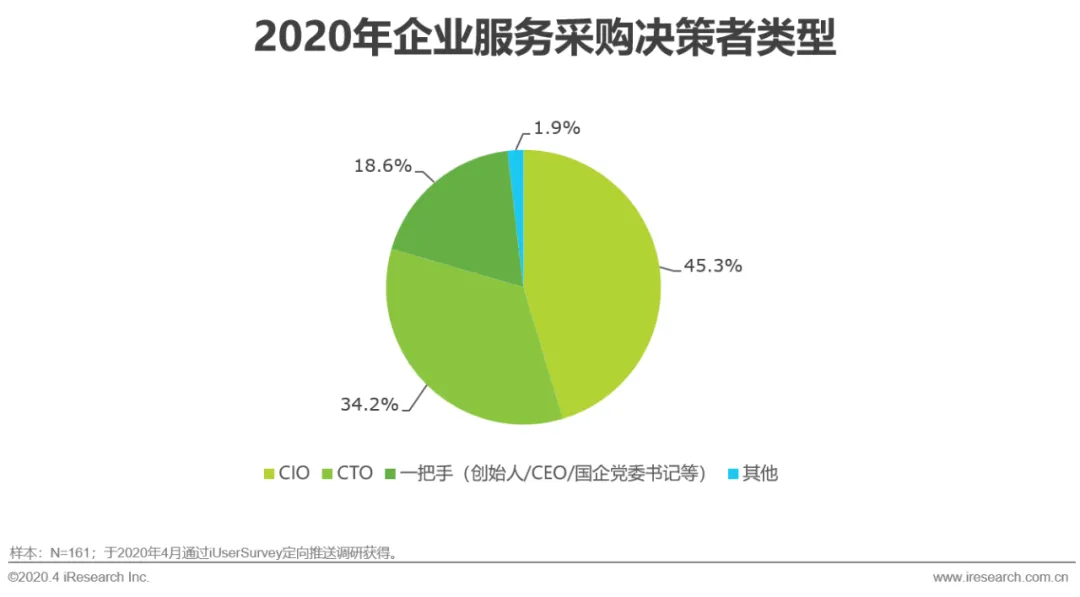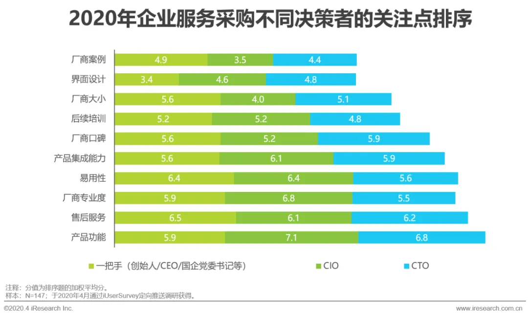 在企业服务采购中,一把手、CIO和CTO作为决策者的类型均有,而三种类型决策者的关注点并不相同,一般来说,CIO更为“自信”,更不看重厂商大小、厂商过往案例等要素。三种类型决策者均对产品功能、售后服务、厂商专业度、易用能力等更为关注。