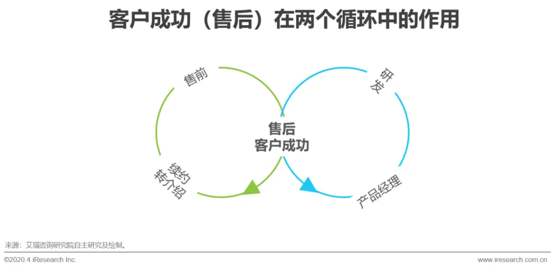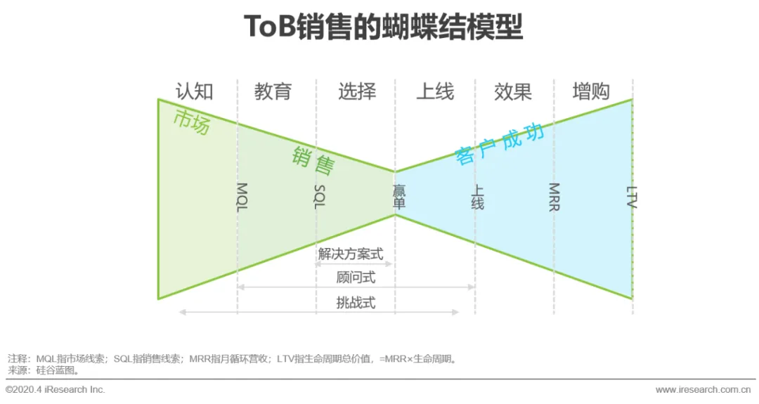不管是传统的外包服务,还是云服务(软件即服务、平台即服务、基础设施即服务),其着眼点都是“服务”。从甲方视角,云服务并不是软件或者硬件简单地迁移到线上,基于线上线下结合的客户成功,解决最后一公里难题,最能体现企业服务的“服务”价值。从乙方视角,客户成功(售后演进而来,且常不作严格区分)位于销售和研发两个循环中,既关系到续约和转介绍,又关系到能不能收集客户的需求和问题,产品和服务能不能持续迭代更新。另外,To B服务的销售模型和To C也有较大区别,To C销售一般遵循AIDCA漏斗模型,而To B为蝴蝶结模型,也即“营收蓝海”在初次签单之后的续约和扩需。因此,To B公司应在激励机制上设计售前和客户成功的联动,否则容易造成售前只喜欢拉新,并常过度许诺,导致客户成功团队压力倍增,最终导致服务缺失,口碑下降,续约率降低。