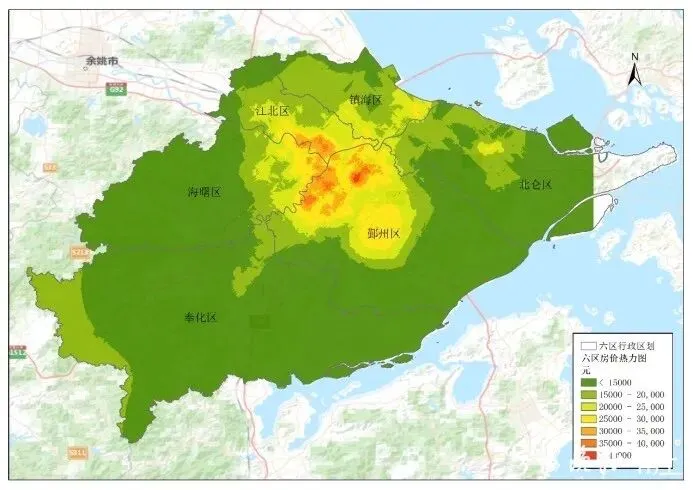 通过将市六区的房价做成插值热力图可以看出,中心城区房价呈现集聚趋势。鄞州区的高房价小区最多,主要聚集在东部新城、鄞州实验中学附近、百丈、白鹤、明楼、长丰、钟公庙、下应等;海曙区的高房价小区主要集中在月湖周边、西门街道的后河小区附近以及青林湾小区周边;江北区则主要集中在湾头、天水广场、余姚江边。