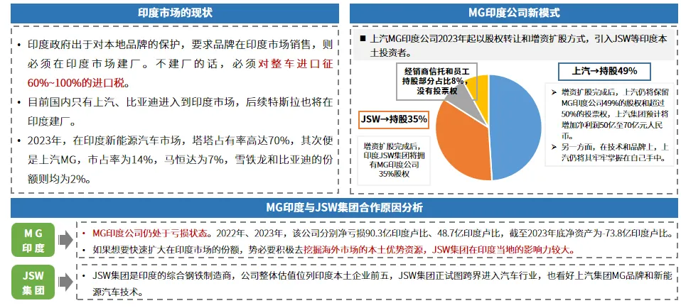 印度政府对于当地品牌的保护比较严重,但印度又是一个具有市场潜力的国家。MG印度多年处于亏损状态,想要扭转局势并实现市场份额的增加,上汽集团采取了股权转让和增资扩股的方式,将35%的股权转让给印度本土龙头企业JSW公司(预计将增加净利润50亿~70亿元人民币);同时将8%的股权转让给经销商和员工,这8%没有投票权,因此在除这8%以外的剩下92%股权中,上汽具有超过50%的投票权,一定程度上保住了上汽在MG印度的话语权。