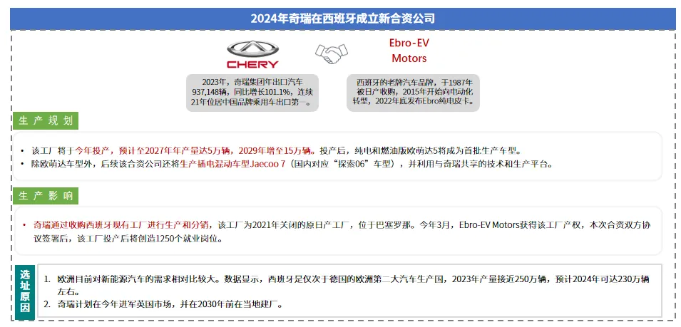 本地化建厂的难度较大,因此一些民族汽车品牌企业会选择与当地的汽车品牌组建合资公司,用他们产能利用率不高的工厂进行本土化生产。2024年,奇瑞与西班牙老牌汽车品牌Ebro-EV Motors(已被日产收购)组建合资公司,将利用2021年已经关闭的原日产工厂生产O&J品牌。这也是既比亚迪在匈牙利建厂后第二个在欧洲建厂的民族汽车品牌。奇瑞还将计划进军英国市场,并在2030年之前在当地建厂。