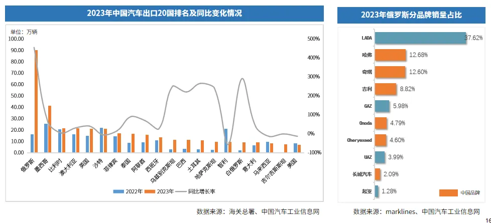 趋同主要体现在对于区域市场的“扎堆”进入现象。由于政治原因,欧美日汽车企业纷纷退出俄罗斯市场。民族汽车品牌顺势进入俄罗斯市场,俄罗斯成为中国最大汽车出口市场。2023年俄罗斯前十品牌销量中民族品牌占6席。