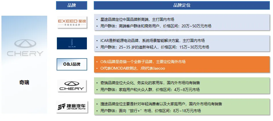 多品牌战略初衷是为了“多生孩子好打架”。为了避免“内伤”,会规划不同品牌的差异化定位。奇瑞汽车目前一共有5大品牌,其中星途、iCAR等品牌以国内市场为主,奇瑞和捷途品牌国内外市场均有布局,而O&J品牌主要以国外市场为主。在俄罗斯市场,为了快速占领跨国品牌不同价位段的市场份额,奇瑞汽车采用多品牌同时进入的战略,奇瑞、星途、欧萌达、捷途 四个品牌均进入到俄罗斯市场。