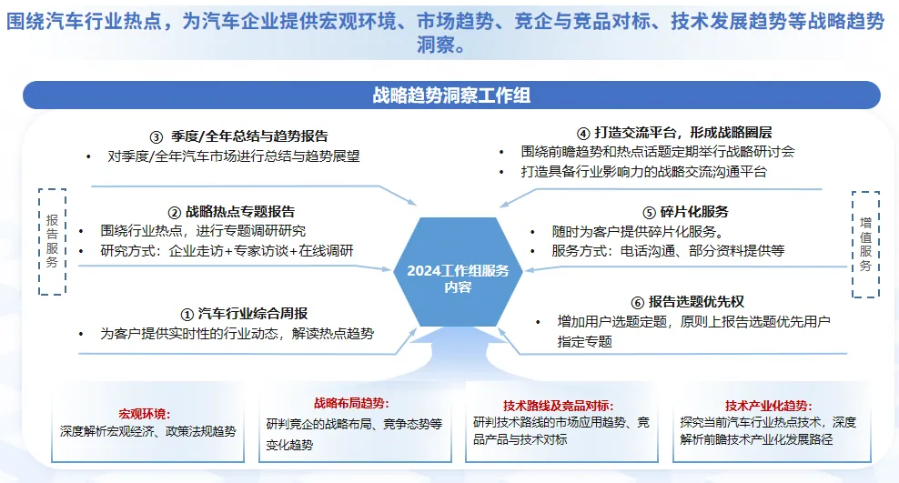 中汽信科战略研究工作组致力于对汽车产业外部环境进行洞察,研究领域包括政策、市场、产品、技术等方面,主要面向企业的战略相关部门,提供周期性报告、战略研讨会、顾问式服务及报告全文检索系统等内容,搭建汽车行业战略规划的“朋友圈”,解决企业常态化的、临时性、突发性对汽车产业外部环境监测的需求。