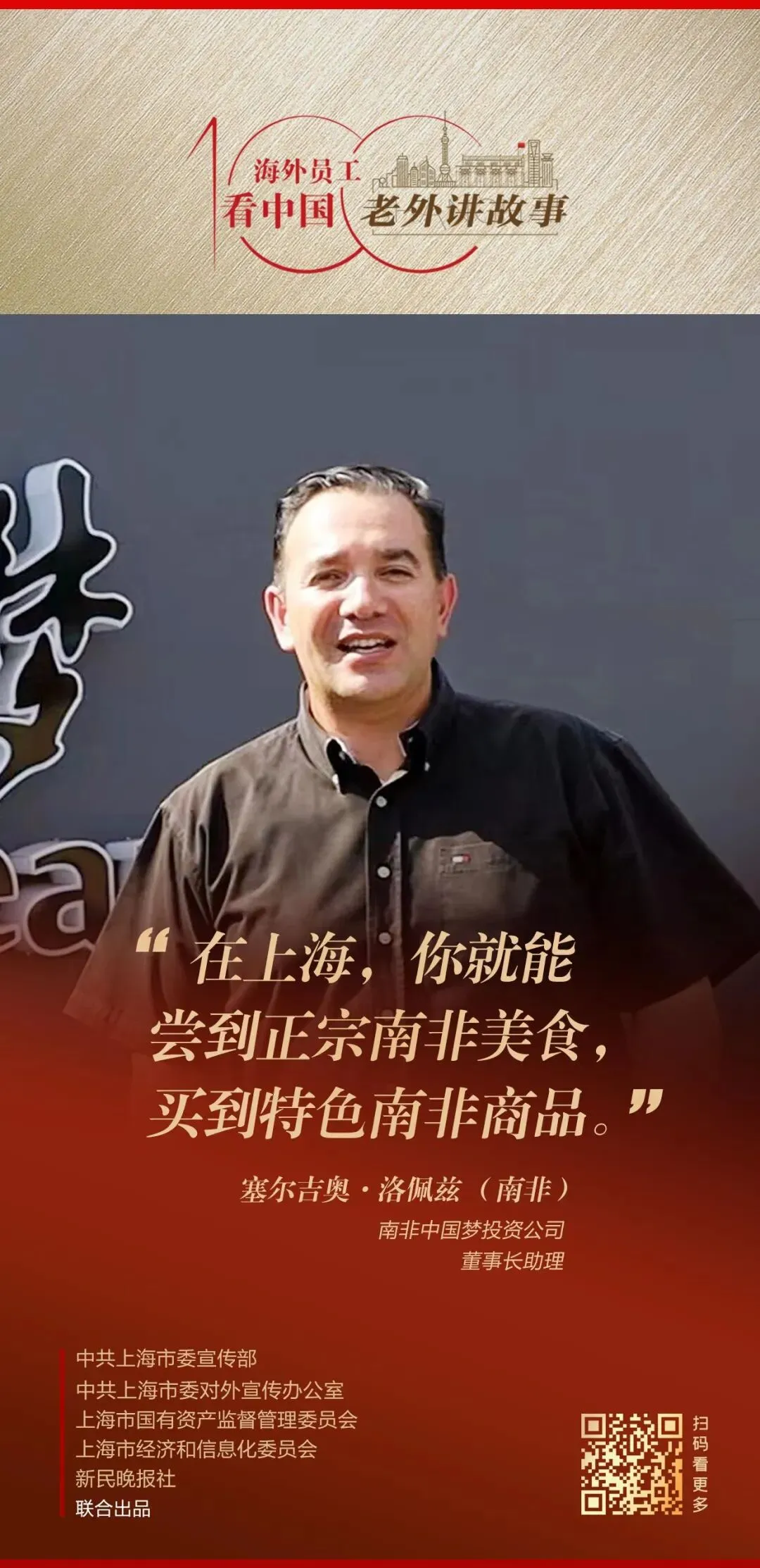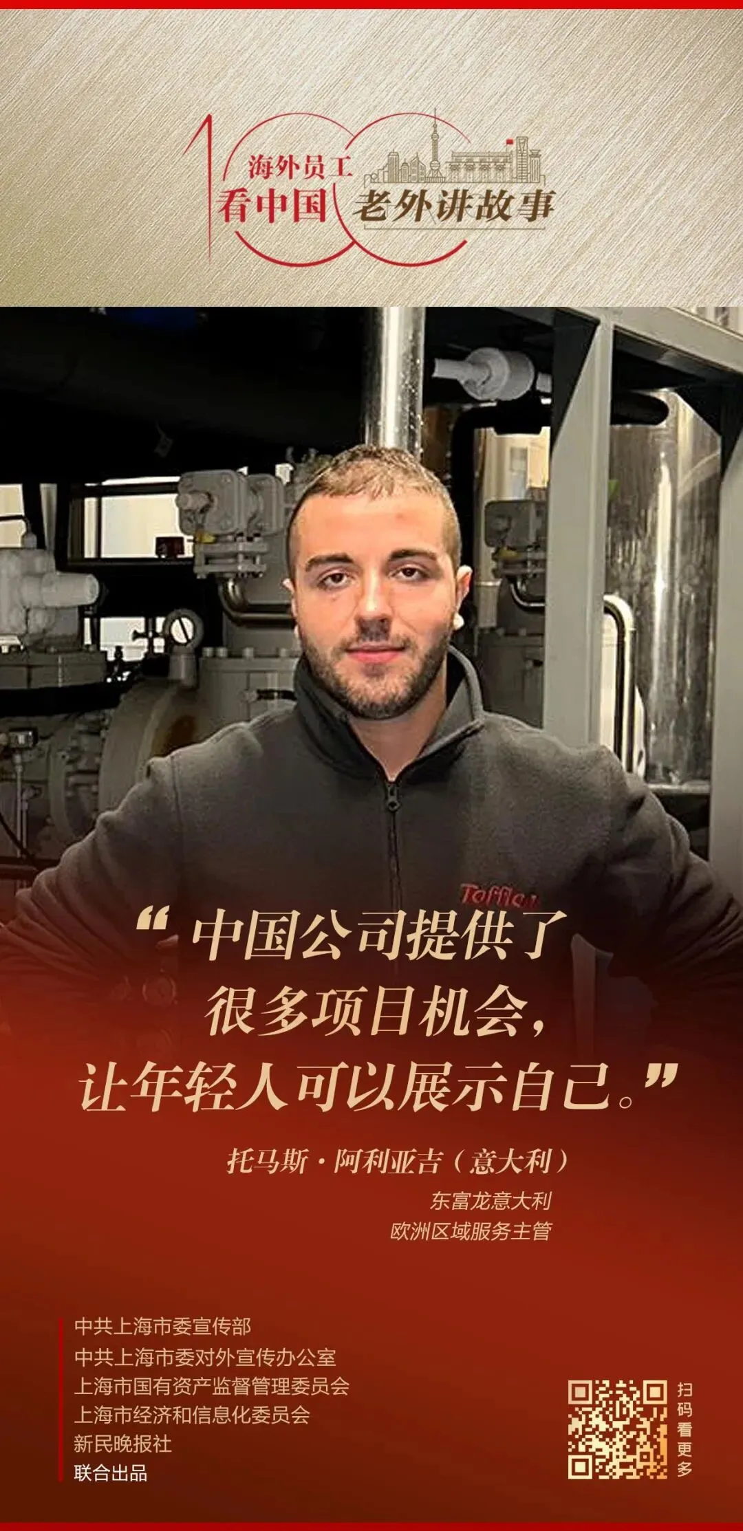 由中共上海市委宣传部、中共上海市委对外宣传办公室、上海市国有资产监督管理委员会、上海市经济和信息化委员会、新民晚报社联合出品的《老外讲故事•海外员工看中国》百集融媒体产品最新推出87-89期内容,南非中国梦投资公司董事长助理塞尔吉奥·洛佩兹、东富龙意大利欧洲区域服务主管托马斯·阿利亚吉、中远海运集运(澳大利亚)有限公司副总经理布莱斯·亨利讲述自己身处中国企业、观察中国的真实感受。详见↓