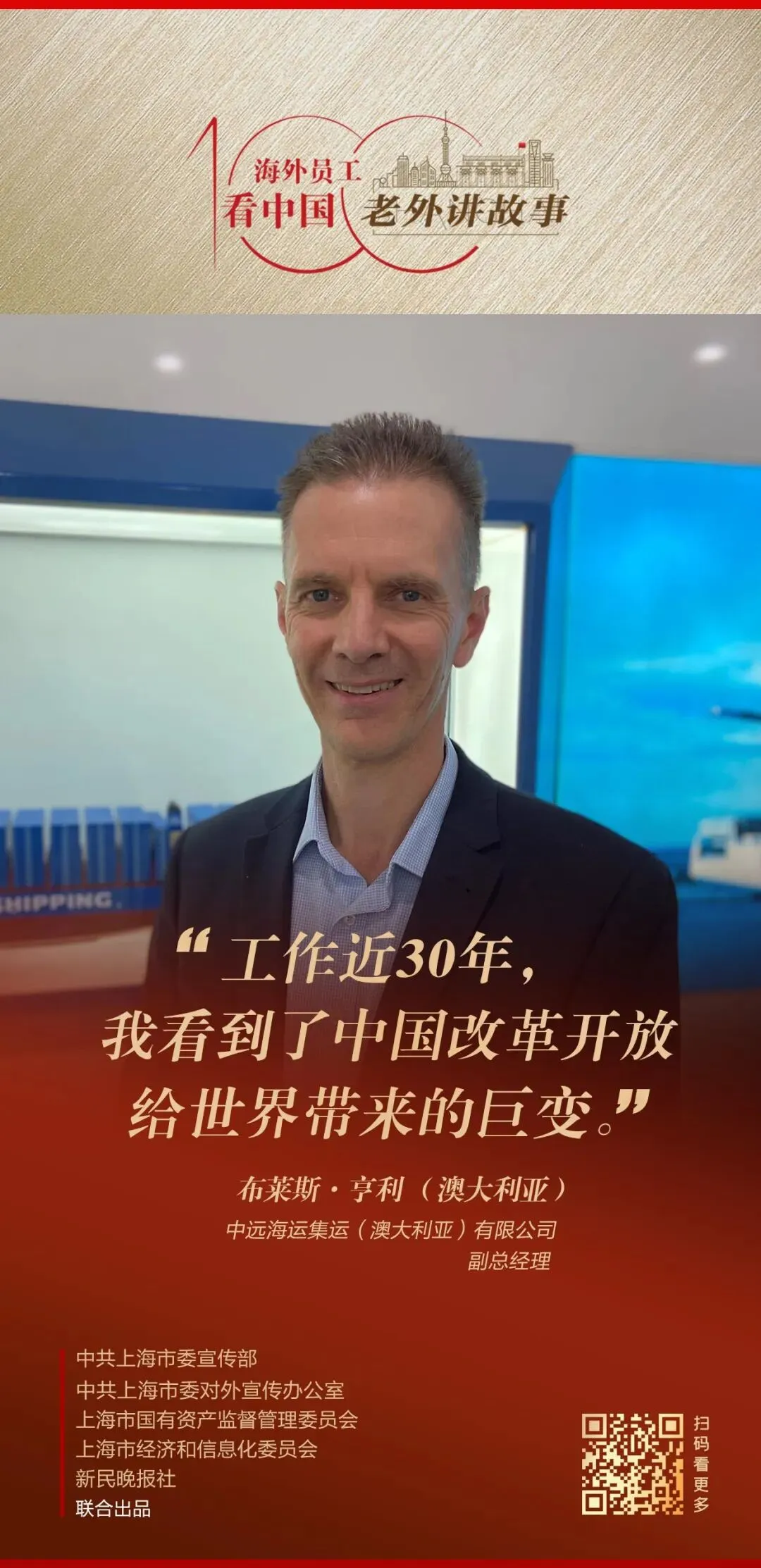 今年54岁的澳大利亚人布莱斯·亨利(Bryce Henley)加入中远海运已有近30年了,他亲历并见证了中远海运在澳大利亚的发展,“中远海运在澳大利亚进口贸易增长中发挥了重要作用;我很高兴也很自豪,能够在这家中国公司拥有这样的职业生涯”。布莱斯说,澳大利亚的经济发展在很大程度上依赖从中国进口,而中远海运集运凭借多条航线服务,对支持澳大利亚进口贸易的增长发挥了重要作用,“在此过程中,我个人也起到了一点点促进作用,为此我感到非常充实和欣慰”。加入中国企业这么多年,布莱斯深刻地感受到中西方文化之间的碰撞,“我认为不同文化之间,没有优劣之分,更没有对错之分,在澳大利亚这个多元的社会中,我深切感到,只有加强交流、加强沟通、加强合作,才能促进企业和个人更好地发展。”
