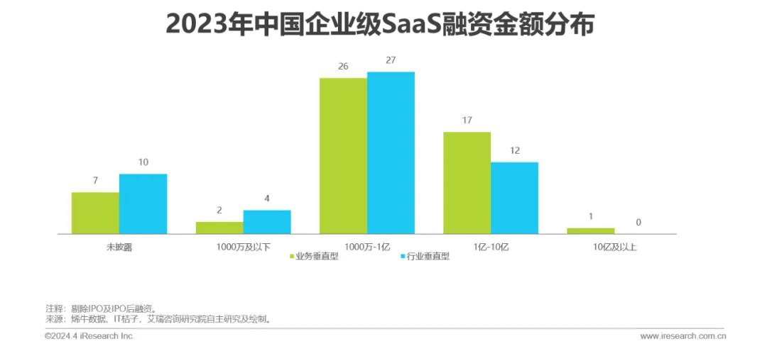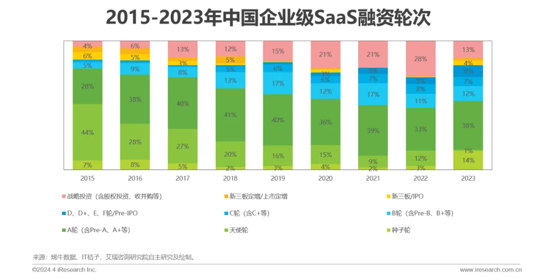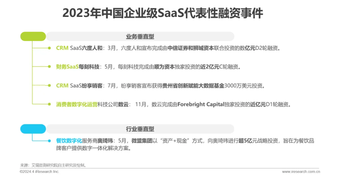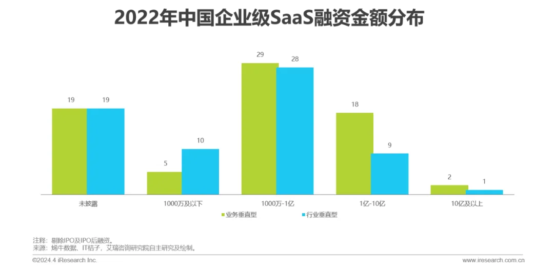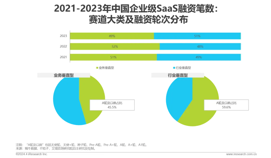 资本动向:2019年以来投融资笔数逐步下滑,整体表现出融资轮次后移的趋势,2023年SaaS领域的天使轮、A轮(含Pre-A、A+等)的占比出现回升,过亿元融资事件数量下滑,其中以行业垂直型厂商居多。行业或将进入由行业垂直型厂商领衔的新一轮成长周期。