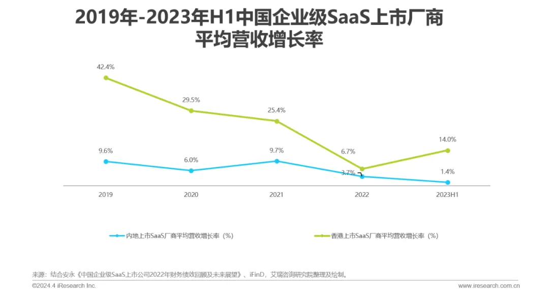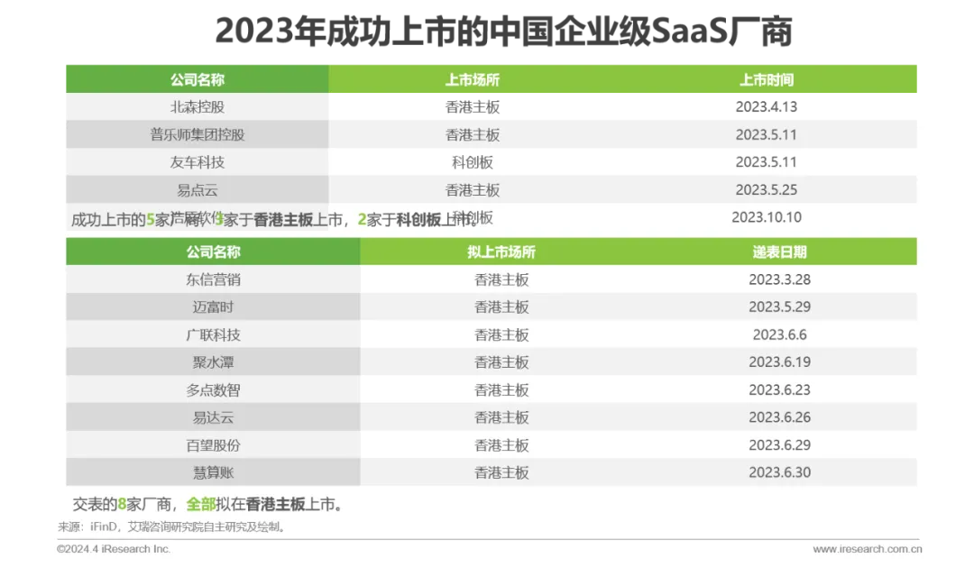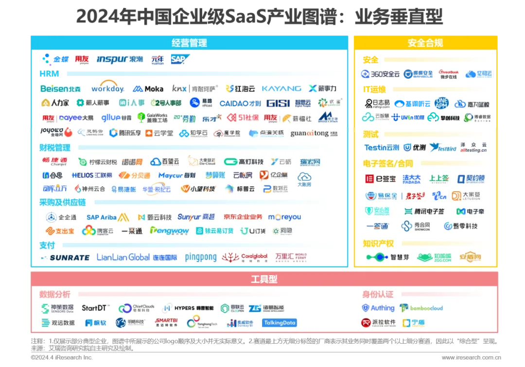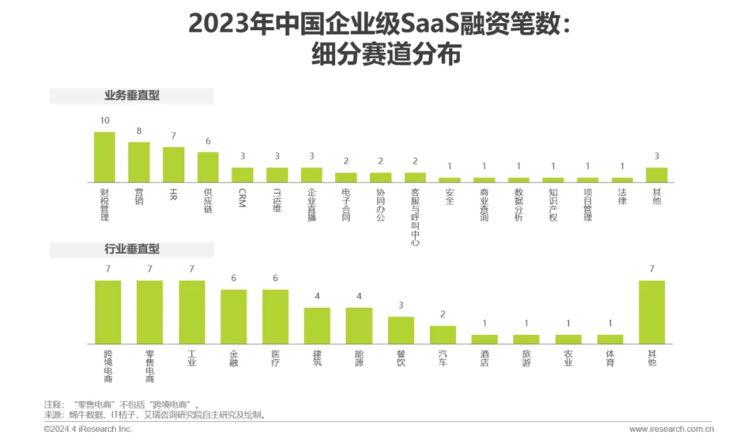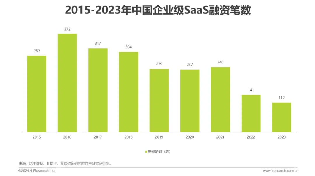 资本动向:2019年以来投融资笔数逐步下滑,整体表现出融资轮次后移的趋势,2023年SaaS领域的天使轮、A轮(含Pre-A、A+等)的占比出现回升,过亿元融资事件数量下滑,其中以行业垂直型厂商居多。行业或将进入由行业垂直型厂商领衔的新一轮成长周期。