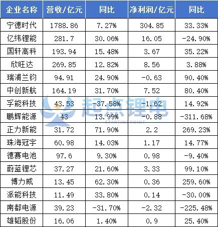 与去年同期相比,电池企业整体业绩实现改善,表格中统计的动储电池企业,超半数实现营收与利润“双增长”。但业绩分化严重,行业马太效应进一步加剧。