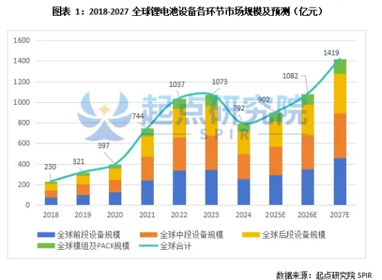 起点研究院SPIR预计到2027年全球锂电设备市场规模达1419亿元,其中前段设备市场规模为460亿元,中段设备市场规模为434亿元,后段设备市场规模为383亿元,模组及PACK市场规模为142亿元。