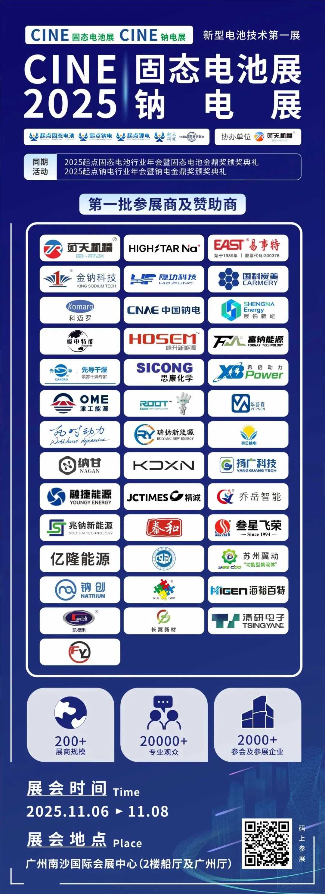 第一批展商及赞助商:金钠科技/茹天科技/海四达钠星/融捷能源/易事特钠电/泰和科技/隐功科技/科迈罗/国科炭美/晟钠新能/中钠能源/乔岳智能/津工能源/科达新能源/时代思康/富钠能源/极电特能/华普森/瑞扬新能源/亮见钠电/叁星飞荣/珠海纳甘新能源/皓升新能源/扬广科技/银川苏银产业园/兆钠新能源/精诚模具/儒特股份/希倍动力/先导干燥/瓦时动力/博粤新材料/苏州翼动新能/亿隆能源/钠创新能源/瑞森新材料/海裕百特/凯德利/长篙新材/清研电子/孚悦科技等