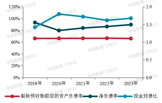 2023年,百强企业剔除预收账款的资产负债率均值为66.1%,净负债率均值为89.7%,现金短债均值比为1.67,净负债率较上年增加3.3个百分点,现金短债比较上年增加0.06。百强企业有息债务相对规模基本持平;债务平均期限略有延长,短期债务占比下降。