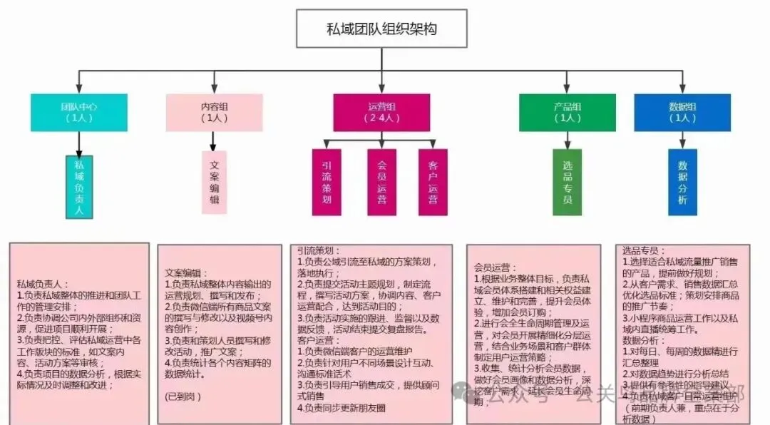 通过以上对小护士品牌的解读,我们认为在私域电商项目中,一个完整的团队通常可以分为引流端和运营端两个板块。