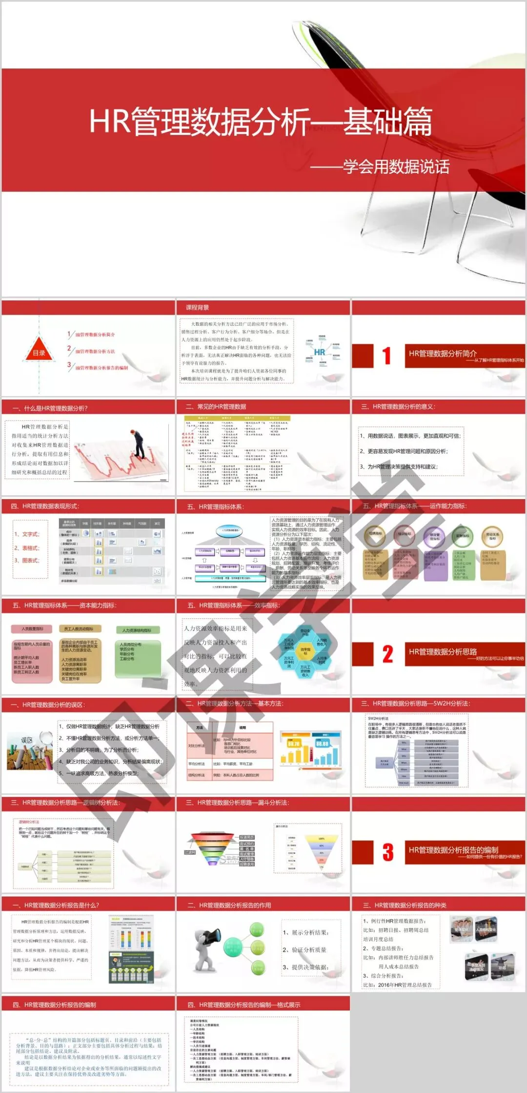 数据分析PPT,既有人力资源各模块通用模板,也有针对招聘、绩效、薪酬、培训等具体模块的数据分析报告。