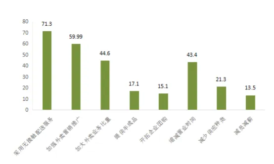 截至2020年3月,从中国餐饮商家采取的主要自救措施来看,我国餐饮行业中有71.3%餐饮商家采取无接触配送服务,所占比例最高;59.99%的餐饮商家加强外卖营销推广,44.6%的餐饮商家加大外卖业务比重,43.4%的餐饮商家缩减营业时间。其他应对方法还有提供半成品、开拓企业团购等新的经营方式。