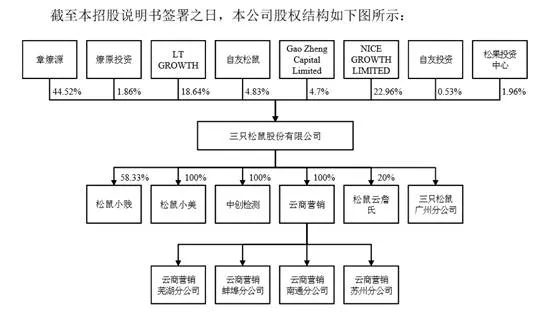 三只松鼠于2012年2月16日在安徽省芜湖市弋江区成立,注册资本100万元。公司成立后,注册资本增加情况如下:2012年7月注册资本增至1,298,701元,2013年1月增至1,367,054元,2013年9月增至1,689,523元,2014年4月5,000万元,2015年9月增至52,593,750.00元,2016年12月增至306,000,000元,2017年3月增至360,000,000元。