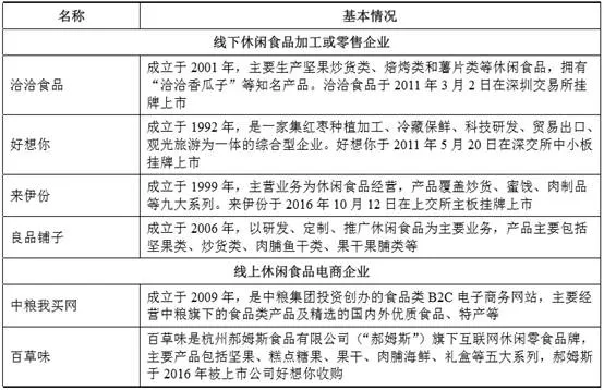 公司的主要竞争对手包括两类,一类为以线下休闲食品生产或零售为主要业务的企业,如洽洽食品、来伊份等;另一类为食品或休闲食品线上零售企业,如中粮我买网、百草味等。