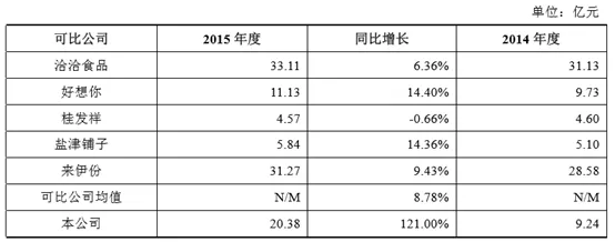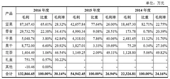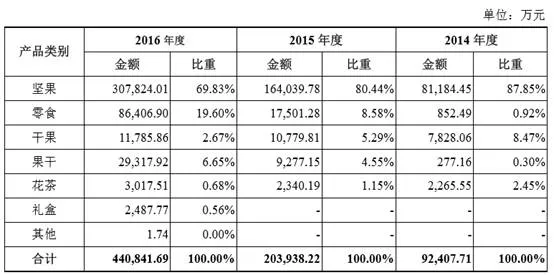 2014年度、2015年度以及2016年度,公司坚果产品的营业收入分别为81,184.45万元、164,039.78万元、307,824.01万元,2014-2016年复合增长率为94.72%;公司零食产品的营业收入分别为852.49万元、17,501.28万元以及86,406.90万元,2014-2016年复合增长率为906.77%。