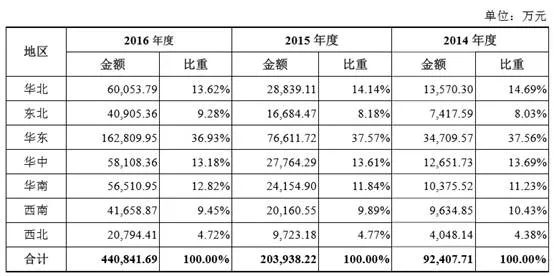 公司主营业务收入主要集中在华北地区、华东地区、华中地区、华南地区,2014 年度、2015 年度以及2016年度,华北地区、华东地区、华中地区、华南地区 的营业收入总额占主营业务收入的比重分别为77.17%、77.17%以及76.55%。
