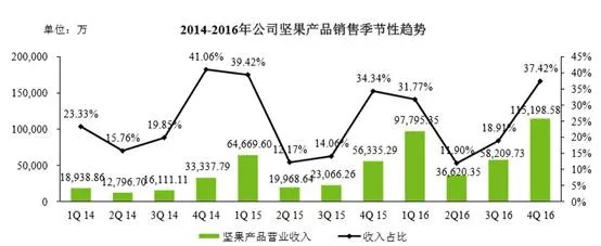 2014年度、2015年度以及2016年度,公司各季度坚果产品营业收入的变化趋势如下: