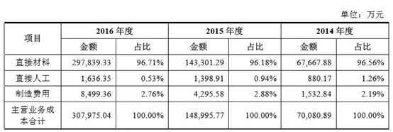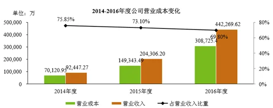 2014年度、2015年度以及2016年度,公司的营业成本分别为70,120.95万元、149,343.49万元以及308,725.38万元,从营业成本的增长情况看,2015年营业成本较2014年增长112.98%,2016年营业成本较2015年增长106.72%,与同期营业收入的变动趋势一致。