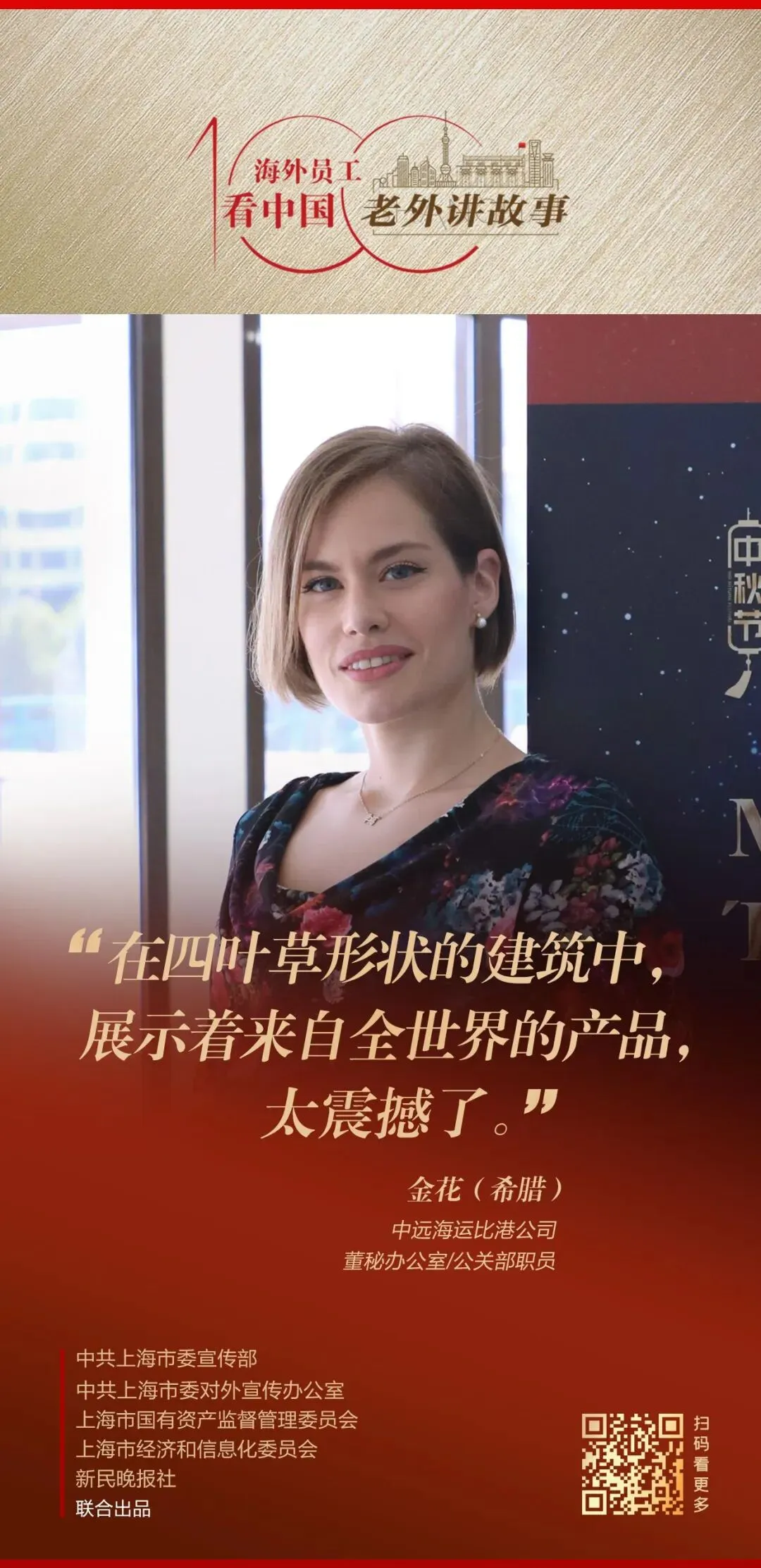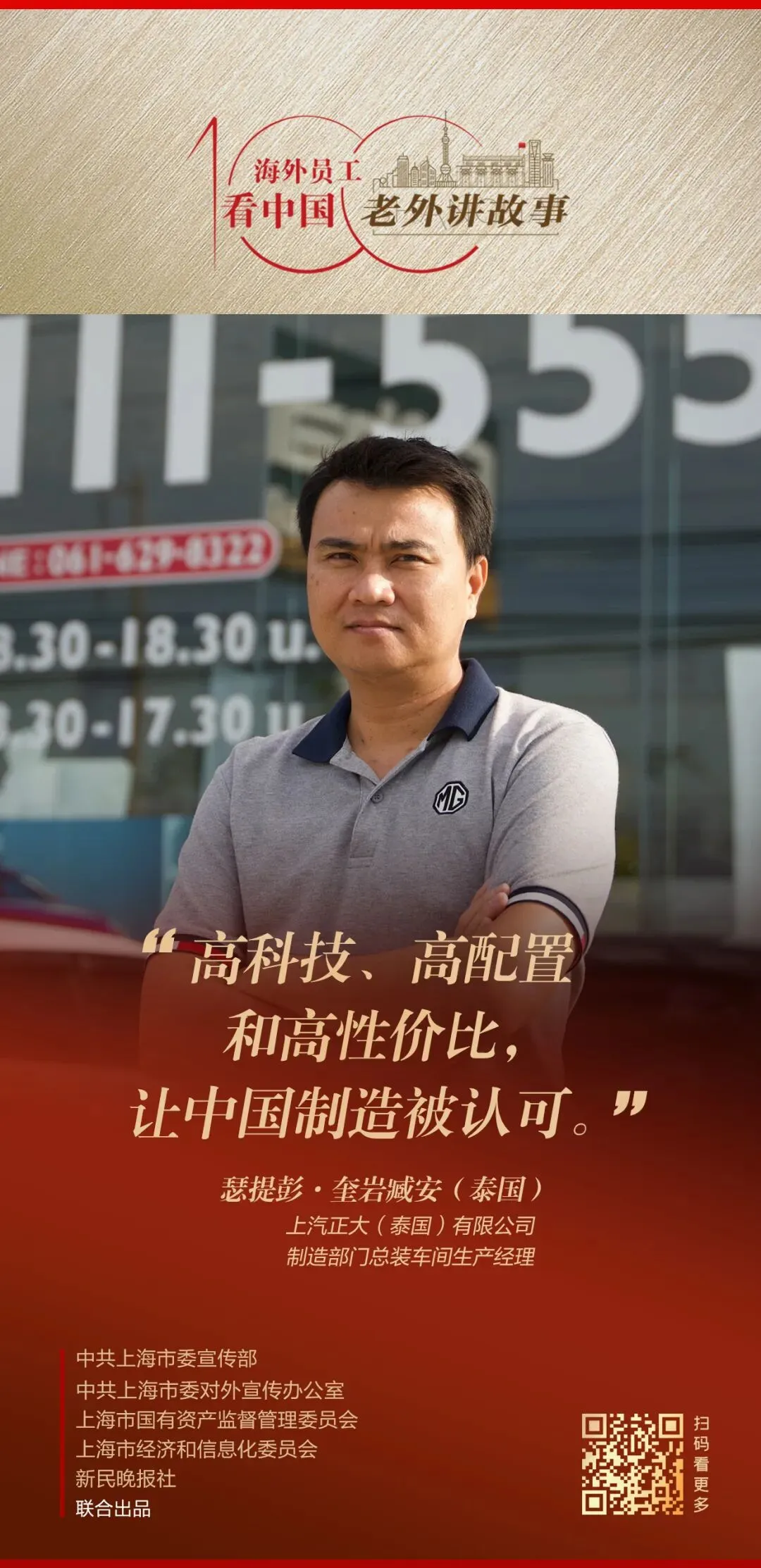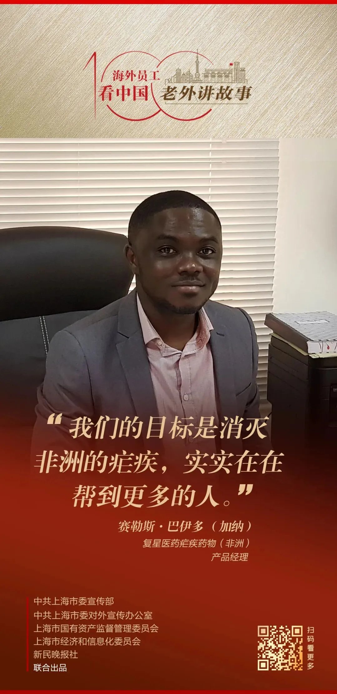 由中共上海市委宣传部、中共上海市委对外宣传办公室、上海市国有资产监督管理委员会、上海市经济和信息化委员会、新民晚报社联合出品的《老外讲故事•海外员工看中国》百集融媒体产品最新推出65-68期内容,复星医药疟疾药物(非洲)产品经理赛勒斯·巴伊多、中远海运比港公司董秘办公室/公关部职员金花、中船能源(新加坡)有限公司贸易执行员傅盛炎、上汽正大(泰国)有限公司制造部门总装车间生产经理瑟提彭•奎岩臧安讲述自己身处中国企业、观察中国的真实感受。详见↓