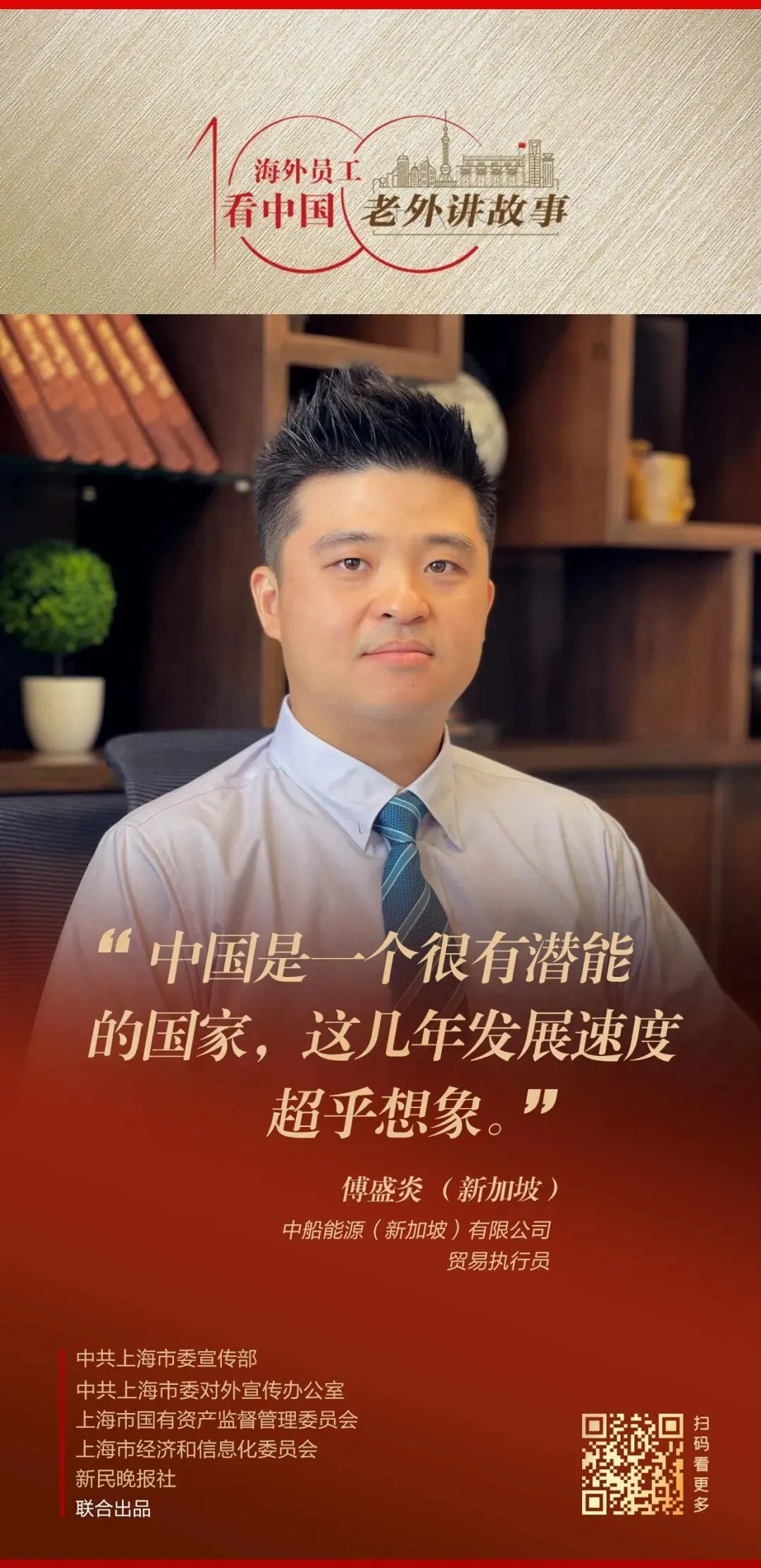新加坡人傅盛炎就职于中船能源(新加坡)有限公司。他是一名贸易执行员,负责公司贸易业务的操作和执行。热爱工作的他,也深深热爱着中国文化与美食。