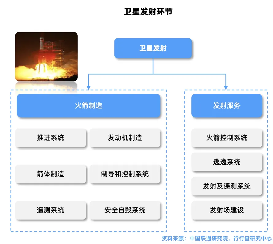 下游:卫星制造与运营以及发射服务延伸及相关应用。