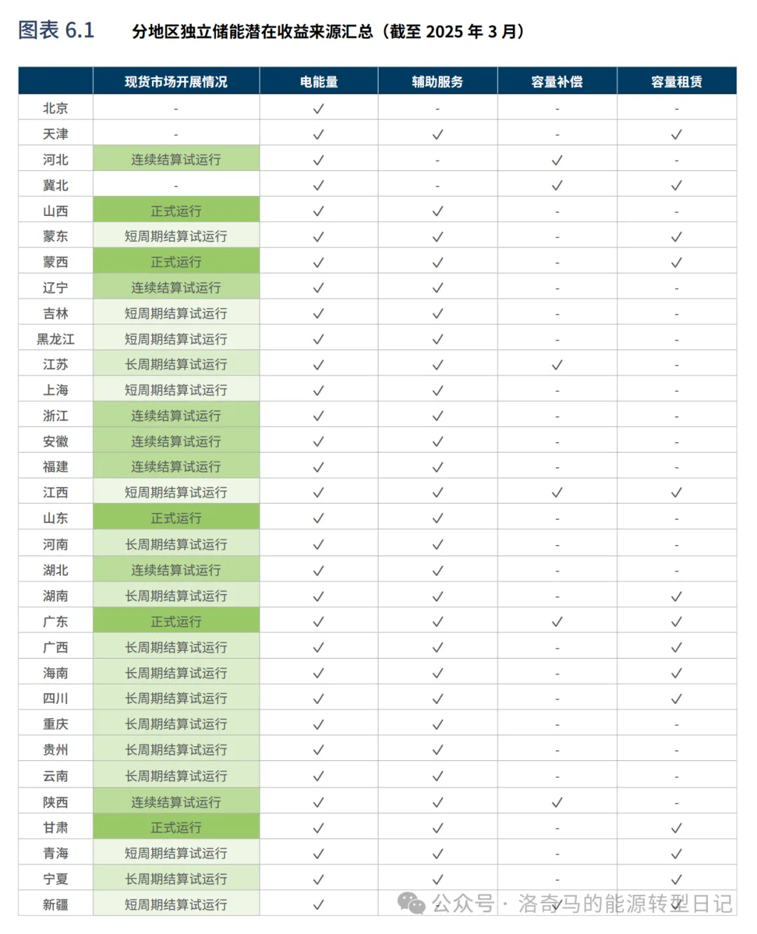 独立储能收益来源多元化发展,呈现电能量市场价差套利为主、辅助服 务和容量补偿租赁为辅的局面随着各地辅助服务市场规则的进一步细化和完善,新型储能的商业模式愈发清晰,部分省份已经可以实现“电能量 + 辅助服务 + 容量机制”的组合收益模式,参与市场收益逐步呈现多元格局。根据落基山研究所统计,截至2025 年初,全国已有至少 16 个省份明确开放独立储能参与现货市场,覆盖了现货市场正式运行和连续试运行的省份。在可以参与现货市场的情况下,独立储能会优先选择参与现货市场,捕捉峰谷电价间的价差空间。