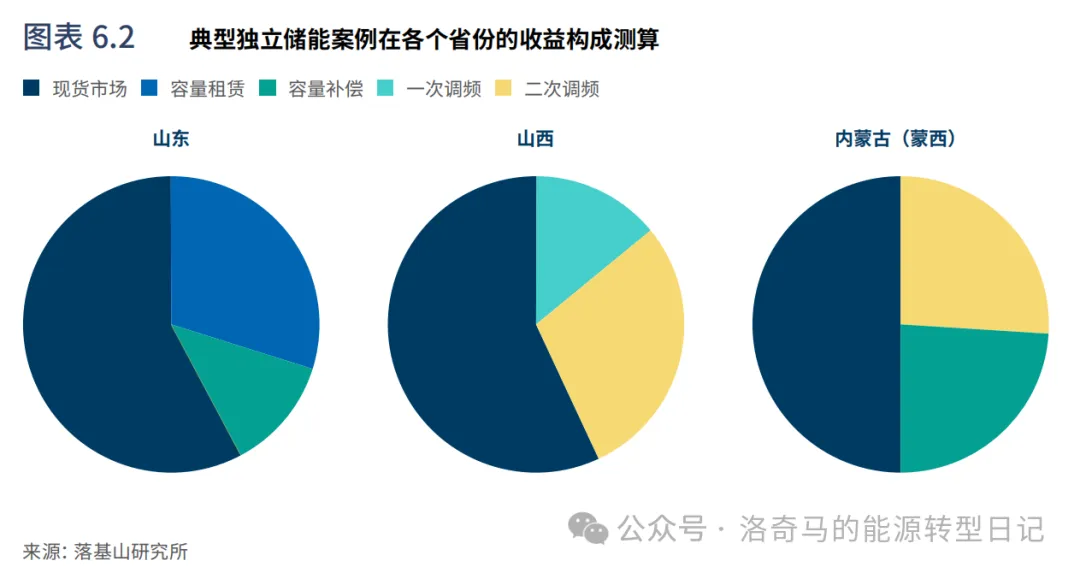 综合考虑各省份的累计储能装机规模及电力市场发展进程,筛选出山东、山西和内蒙古(蒙西)三个省份和地区,对独立储能参与电力市场的收益情况进行了测算。结果显示(图表6.2),辅助服务市场和容量机制的推进显著丰富了独立储能的收益来源,并有效提升了整体收益水平。尽管现货市场收益仍然是独立储能收益的主要支撑,辅助服务市场和容量机制所贡献的收益在整体收益结构中已占据举足轻重的地位。