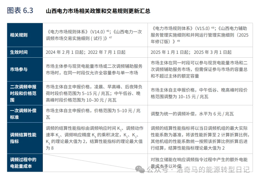 图表 6.3 对比展示了 2025 年前和 2025 年起独立储能在山西参与调频辅助服务所适用的关键规则。新规出台后,对于价格和结算的调整直接影响到独立储能在调频市场中的收益。独立储能参与调频市场的收益主要由实际出清的调节里程、结算性能指标和申报价格这三者的乘积确定。在新的政策下,由于一次调频和二次调频的结算性能指标上限从8 降至 2,意味着在其他条件不变的情况下,独立储能的收益将大幅缩水。
