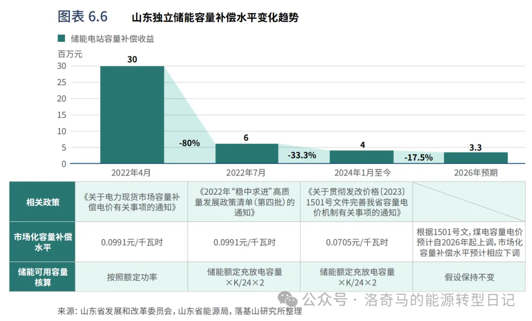二是容量补偿会与市场充分衔接。固定容量补偿的方式将不会是未来容量补偿机制的主流形式。虽然在前期固定补偿可以作为鼓励性机制鼓励独立储能的投产,但是缺乏和电能量等市场的衔接配合,不足以形成一种可持续的机制,在各地补偿水平的退坡也印证了这一点。山东的模式既确认了储能可用容量的计算方式,又通过与市场结合明确了容量补偿的分摊方式,我们认为这种方式可作为测算未来各地市场化容量收益的参考之一。