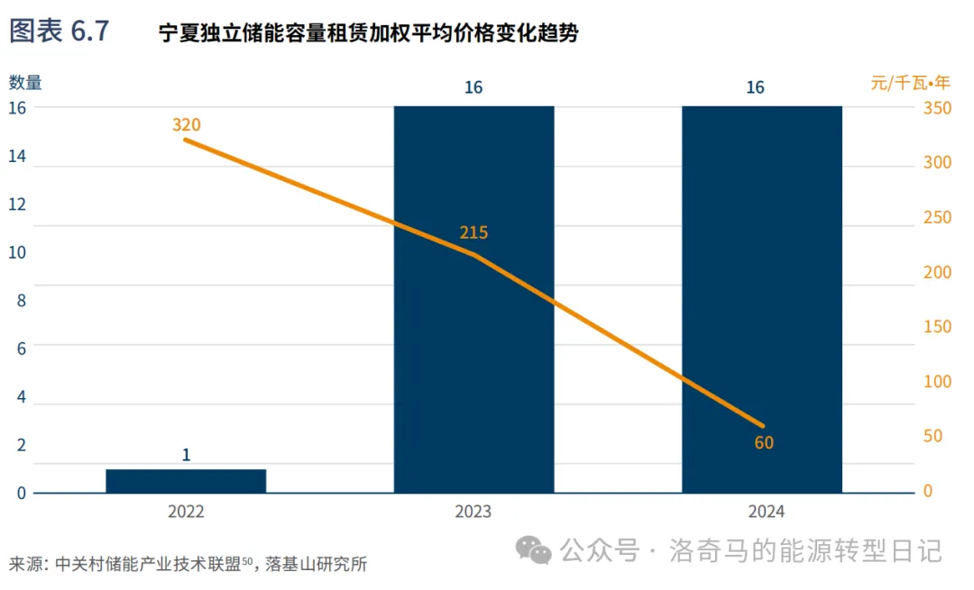 除容量补偿外,容量租赁也是容量机制的一部分。自 2022 年来,宁夏、甘肃、江苏、河南、山东、河北、新疆等省份和自治区发布关于开展容量租赁的相关细则。虽然各地均有给出容量租赁的指导价格,但是最终的成交价格由具体的独立储能和新能源电站双方确定。在租赁周期的约定上,各地细则均有所不同,四川要求租赁周期最短不少于三年,新疆要求不少于一年,冀北没有明确给出下限。从实际的交易情况看,市场中容量租赁的价格普遍低于政策指导价格,租期普遍为一年。以宁夏为例(图表 6.7),宁夏的容量租赁成交项目在全国范围内最多,在容量租赁政策发布的首年(2022 年),成交项目 1 个,租赁价格达到 320 元 / 千瓦·年;次年成交项目 16 个, 加权平均价格在 215 元 / 千瓦·年;2024 年成交项目 16 个,加权平均价格跌落到 60 元 / 千瓦·年左右,容量租赁成交价格呈现出明显的逐年减少的趋势。