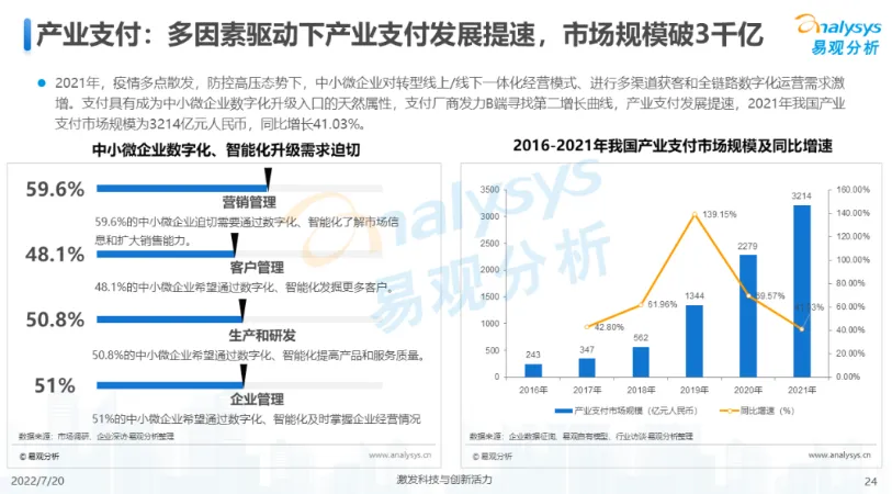 上述报告显示,近来,我国产业支付快速发展,2021年相关市场规模为3214亿元人民币,同比增长达41.03%。