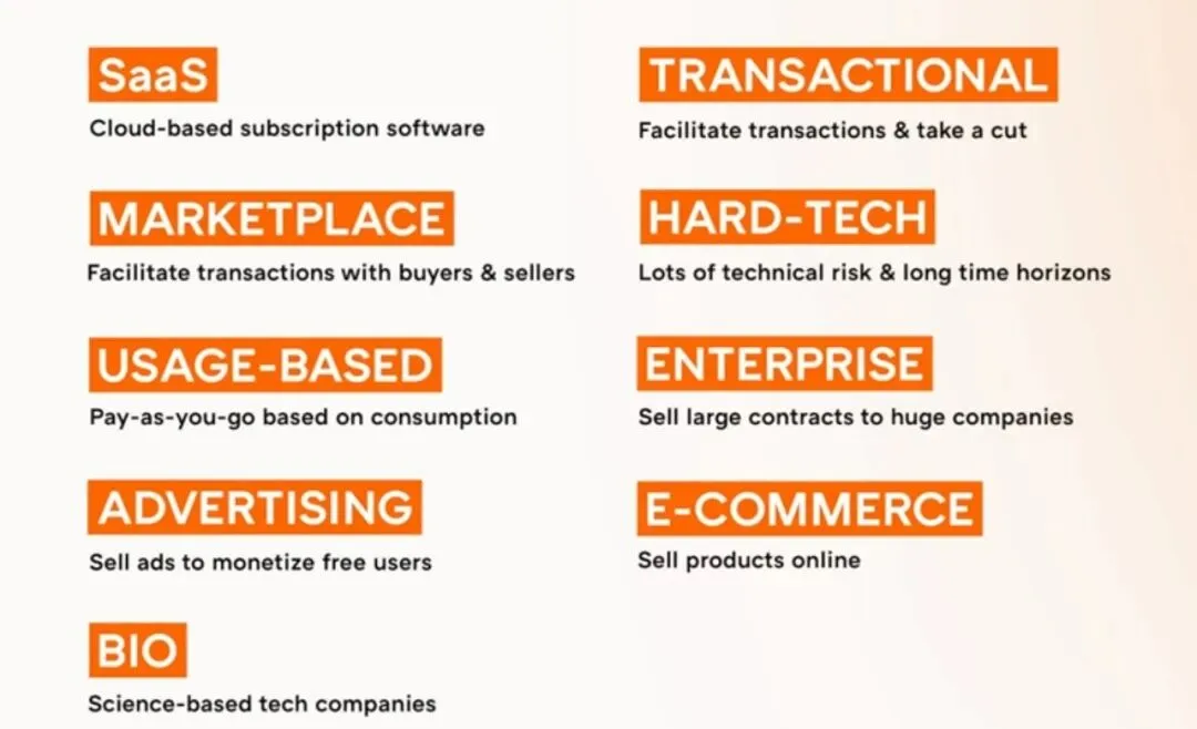 本文不会深入探讨这些商业模式的细节,而是为你提供一个商业模式指南,例如每种商业模式重要的产品/业务指标,方便你根据公司的业务,参考同类公司的商业模式。